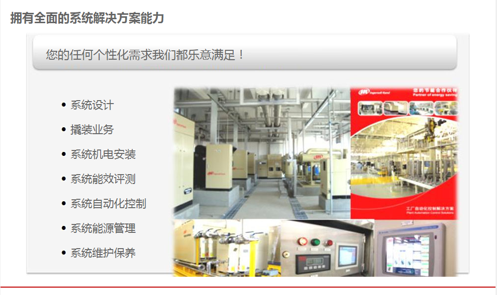 •        濟(jì)南銳博特機(jī)械設(shè)備有限公司是英格索蘭空氣壓縮機(jī)的授權(quán)代理商,代理銷售美國英格索蘭全系列的空壓機(jī)及后續(xù)處理設(shè)備。公司自成立以來,經(jīng)過公司全體同仁不斷努力,開拓創(chuàng)新,以優(yōu)良的技術(shù)、完善的售后服務(wù),使得公司贏得了一個又一個的誠心客戶。我公司擁有多名專業(yè)的銷售及售后服務(wù)人員,為客戶提供空壓系統(tǒng)的售前、售中及售后的全方位優(yōu)質(zhì)服務(wù)。另公司有多名具有英格索蘭壓縮機(jī)授權(quán)服務(wù)證書的服務(wù)工程師,能維修和保養(yǎng)國內(nèi)外各種品牌空壓機(jī),公司各種國內(nèi)外品牌空壓機(jī)配件庫存齊全。
